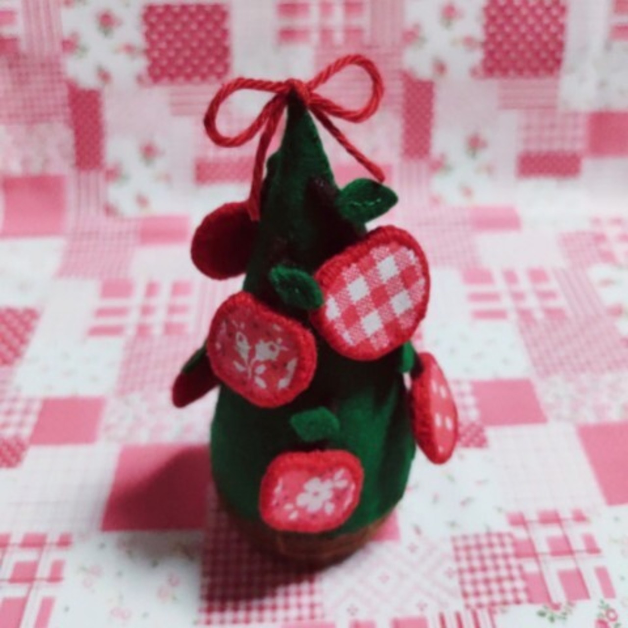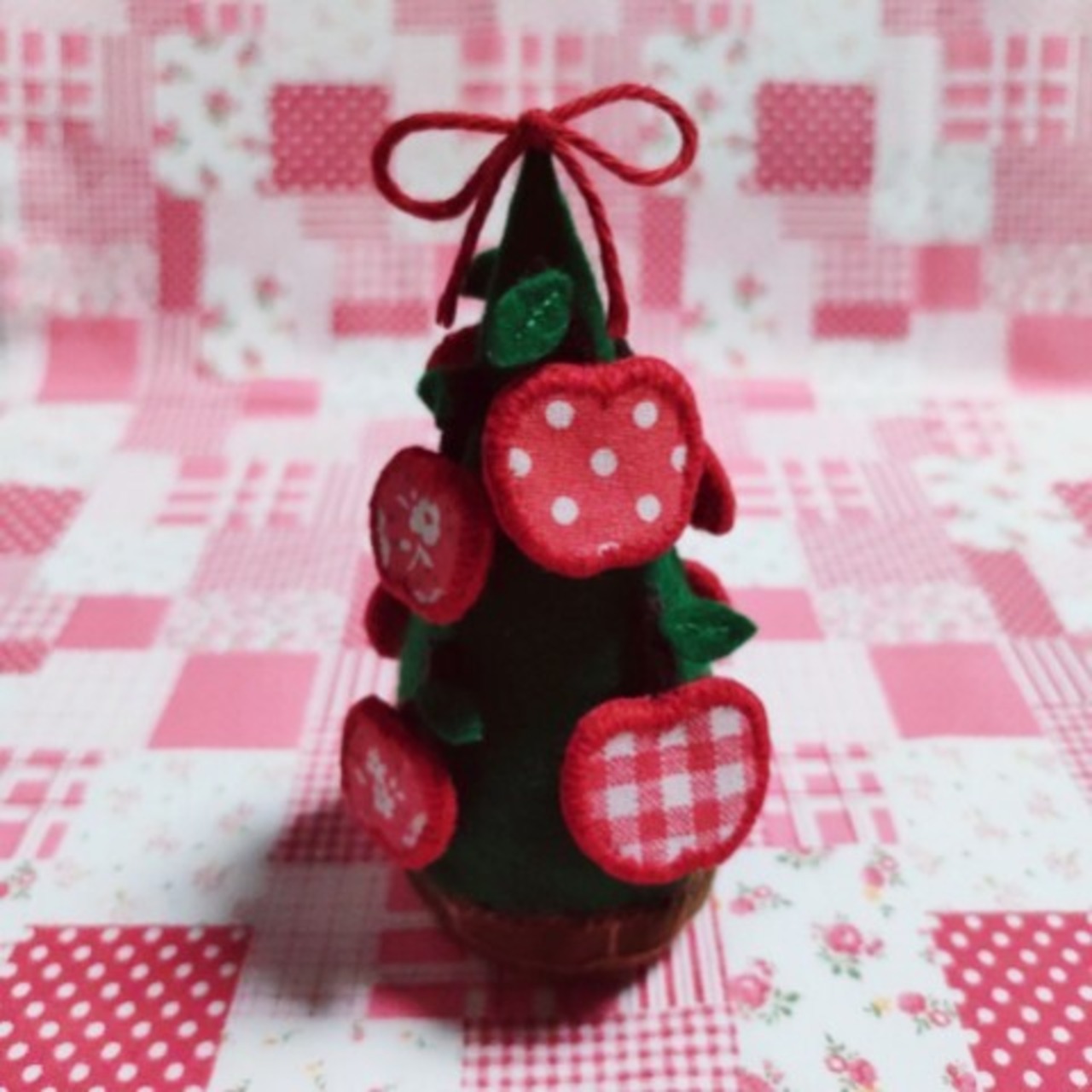 円錐型のツリーに、レトロ可愛いギンガムチェック、水玉、小花模様の赤りんごのオ―ナメントがたくさんついています。